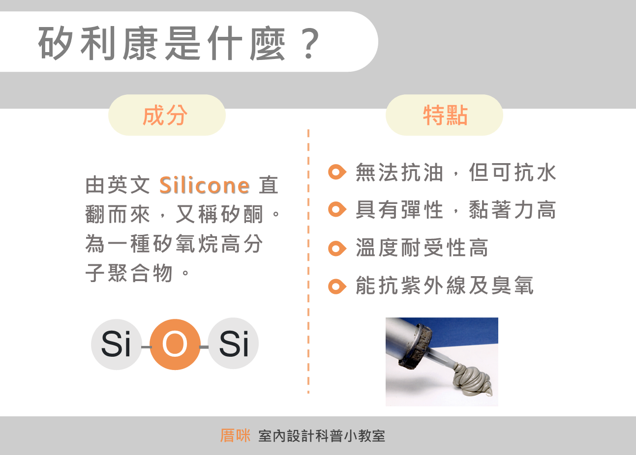 矽利康為英文 Silicone 空耳而來,又稱矽酮。生活周遭中,無論是浴室邊緣、地板收編,到陽台角落、乃至管線、排水孔附近都能看到白白半透明,摸起來彈彈的矽利康。不僅防水抗紫外線,還能當作黏著劑、填縫劑等使用,可謂裝修物品中協槓代表。