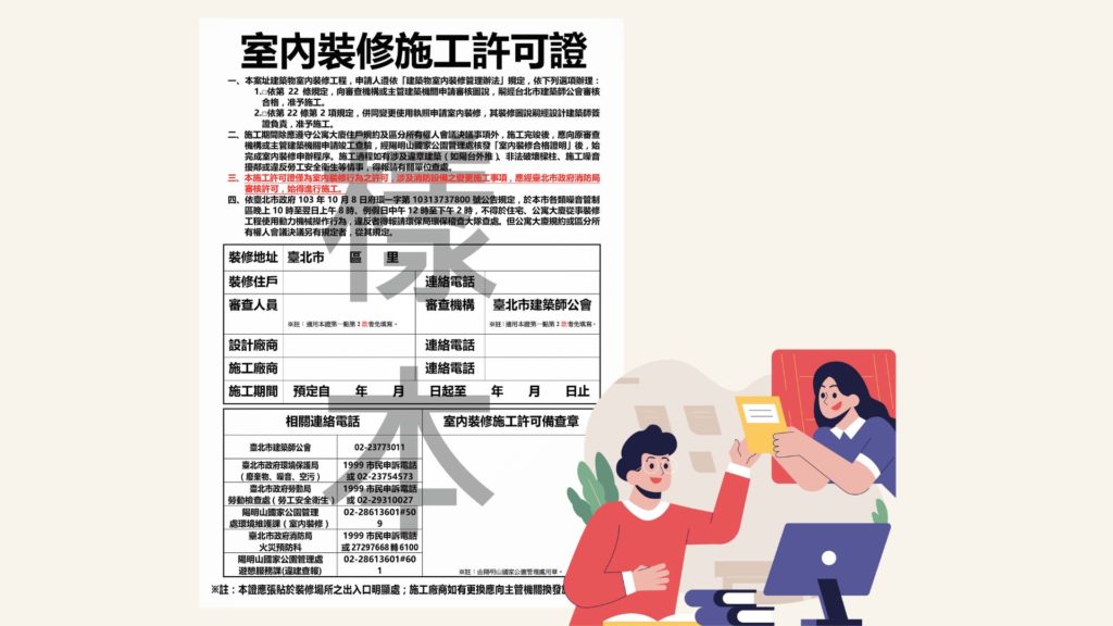 之前的文章有說到,「建築物室內裝修管理辦法」裡明訂,只要是讓大眾使用的建物,或是可被視為公眾所使用的六層樓以上集合式住宅,在裝修的時候,都必須事先申請好裝修許可。一般來說,簡易式審查的室內裝修許可費用,大約落在 NT 30,000 左右,可透過建築師或室內設計師代為申請。