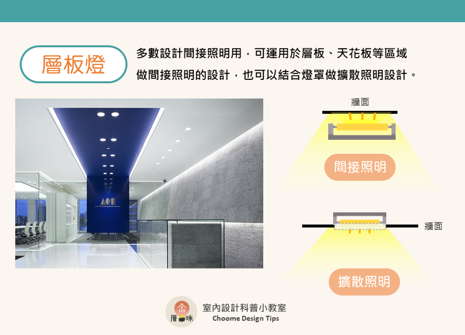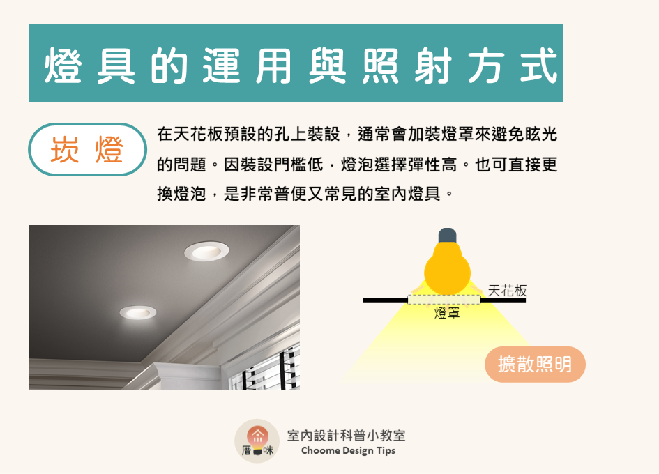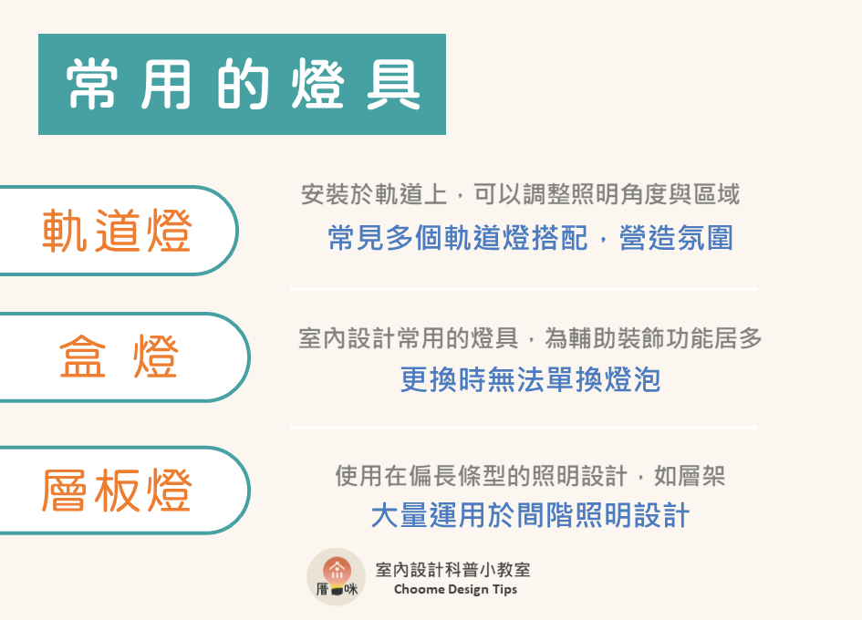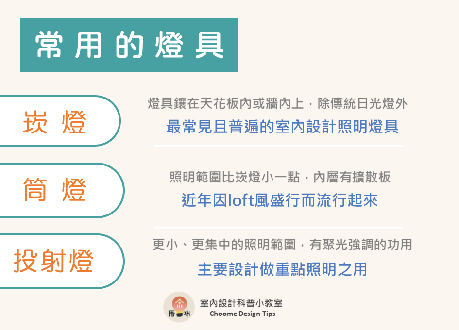現代室內設計中,光線的運用與層次是非常重要的環節,近年來紛紛捨棄的傳統螢光燈、日光燈的直接照明模式,改用功能更多元的燈具來創造室內光線,今天就一起來看看不同燈具的用途跟功能吧!