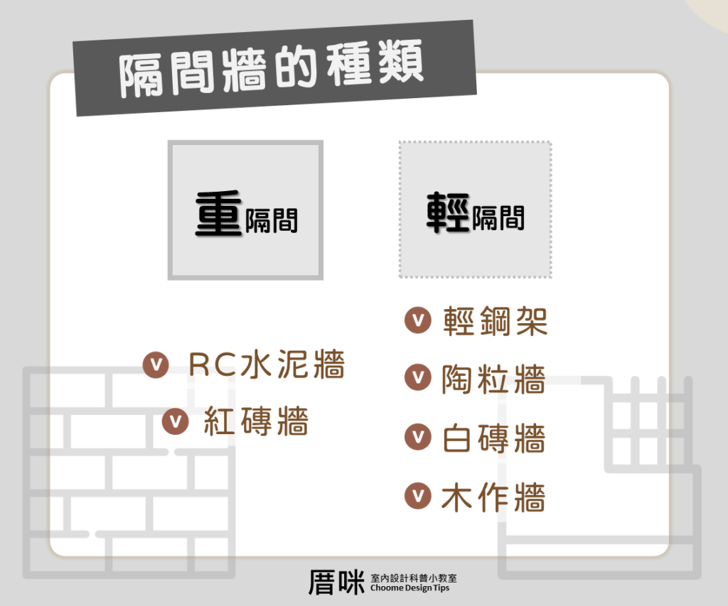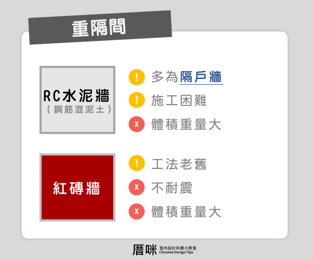 重隔間:分為鋼筋水泥牆,以及紅磚牆兩種,都是建築物「隔戶牆」,也就是不同戶之間的棟梁大牆才會用此牆隔開。