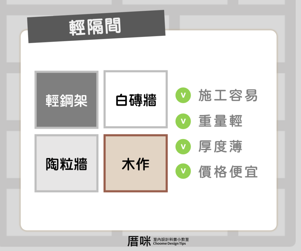 輕隔間:常見輕鋼架、陶粒牆、白磚牆、木作牆,可做為室內格局規劃分隔用。