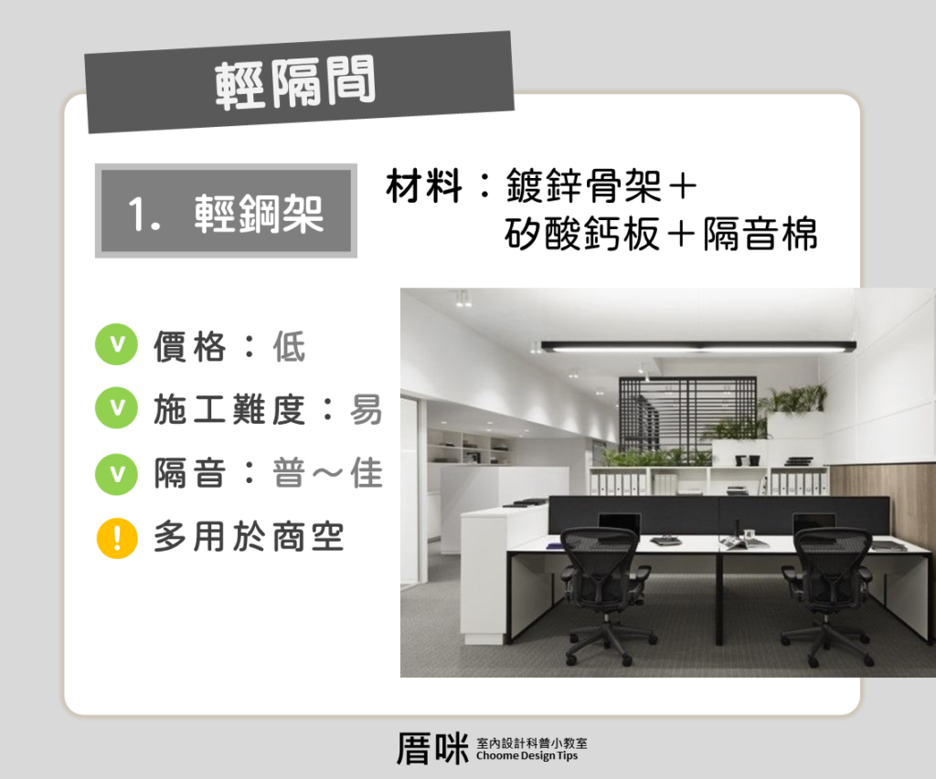 輕鋼架:輕鋼架便宜施工快速,但牆面空心感較重、隔音較差。常見由輕鋼架+矽酸鈣板與隔音棉,多用於大面積的辦公室或是分租套房等地。也可以另外灌漿到牆面內增加隔音效果與壁面的吊掛力,但成本就會跟著提高。
